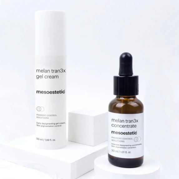 - melan tran3x концентрат. Интензивен депигментиращ агент, който действа върху прекомерната епидермална пигментация, като видимо намалява тъмните петна.